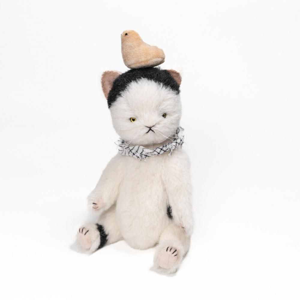 個性的な髪型(模様)の猫のカツヲさんです。ひよこはお友達です。